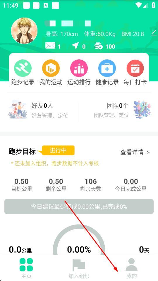 1、打開位動酷跑App,進入主界面,點擊底部導航欄中的我的選項。