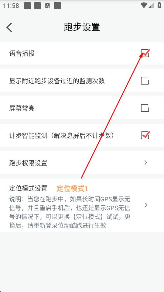 5、進入跑步設置頁面后,找到語音播報選項,取消勾選其右側的方框,即可關閉語音播報功能。
