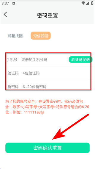 3、輸入注冊的手機號碼等信息后,點擊密碼確認重置,完成找回后即可登錄。