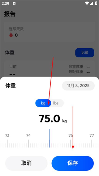 3、設(shè)置體重?cái)?shù)值,點(diǎn)擊保存,即可完成體重記錄。