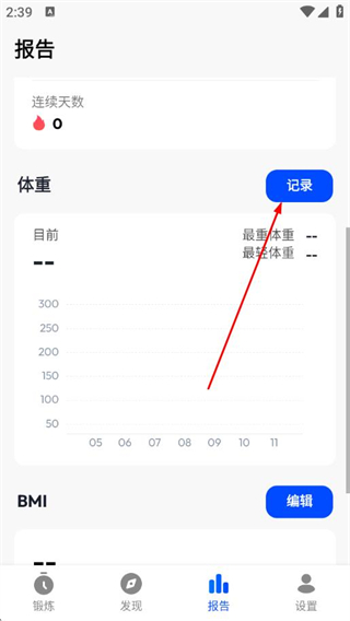 2、在報(bào)告頁面找到體重板塊,點(diǎn)擊記錄。