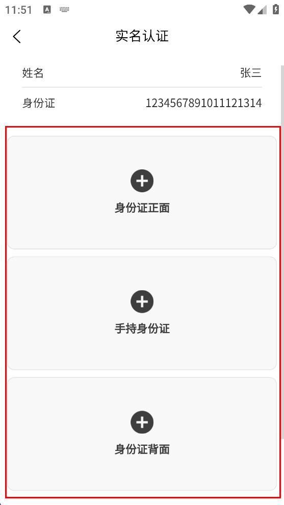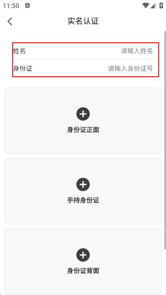 4、填寫好姓名和身份證號后,依次點擊“身份證正面”“手持身份證”“身份證背面”對應(yīng)的“+”號,上傳相應(yīng)的身份證照片,完成實名認(rèn)證流程。