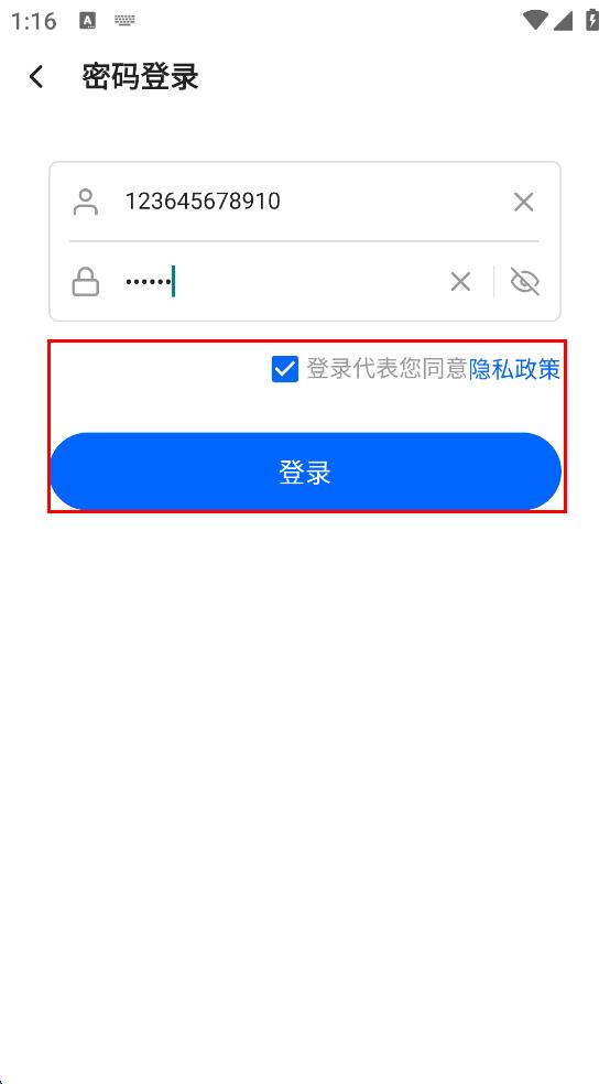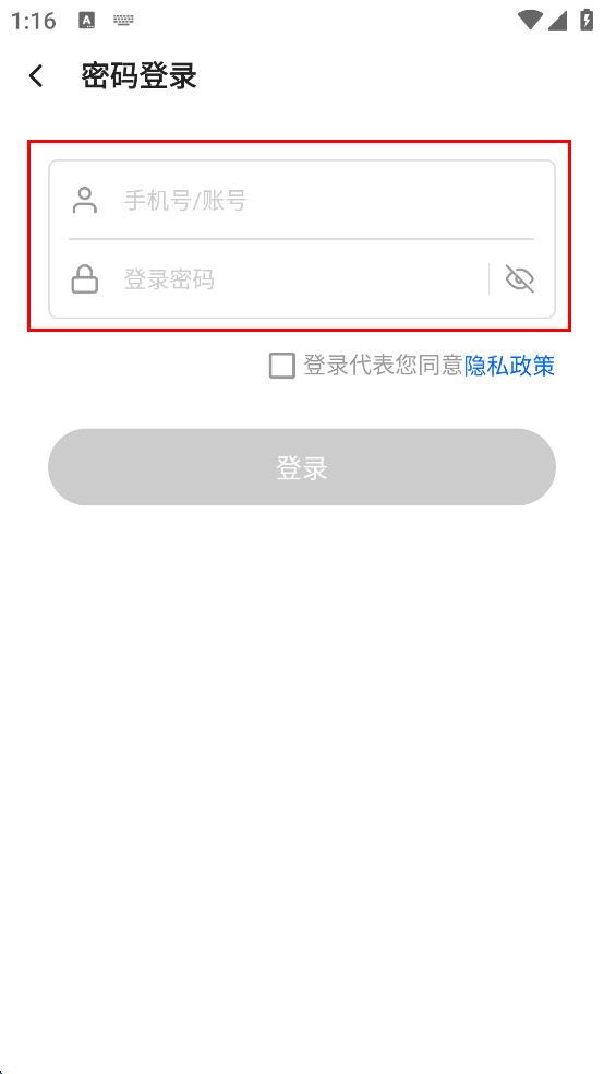 3、在密碼登錄頁面,依次輸入手機(jī)號(hào)/賬號(hào)和登錄密碼。