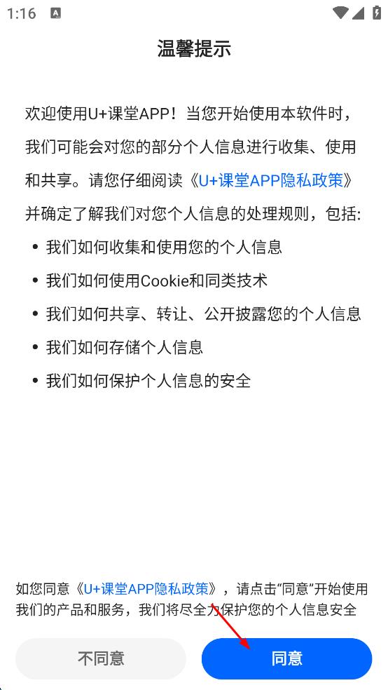 1、打開U+課堂應(yīng)用,在溫馨提示彈窗中,點(diǎn)擊同意按鈕,進(jìn)入登錄界面。