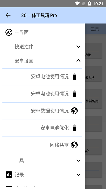 此軟件結(jié)合了其他應(yīng)用程序的許多功能,組合成一個(gè)實(shí)用的工具箱,易于使用的界面,3C工具箱有你需要的系統(tǒng)控制、電池管理、安卓設(shè)置等多種功能。