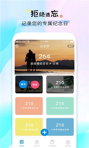 各種紀(jì)念日容易遺忘?在本款A(yù)PP中進(jìn)行添加保存吧,可以設(shè)置你的紀(jì)念日背景和置頂顯示,讓你的紀(jì)念日成為專屬定制。