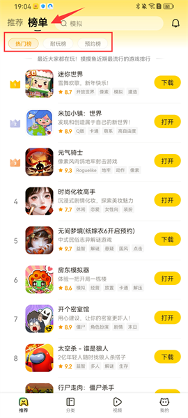 2、切換到榜單頁面,會有熱門榜/耐玩榜/預(yù)約榜分類,也可以直接點擊上方的搜索框,輸入想玩的游戲名稱一鍵搜索,非常便捷;