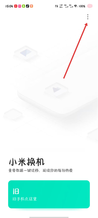 1、打開(kāi)小米換機(jī)應(yīng)用主界面,找到右上角三點(diǎn)樣式的菜單圖標(biāo),點(diǎn)擊該圖標(biāo)。