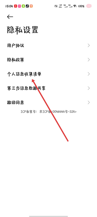 3、在隱私設(shè)置頁(yè)面里找到個(gè)人信息收集清單選項(xiàng),點(diǎn)擊該選項(xiàng)進(jìn)入對(duì)應(yīng)的清單。