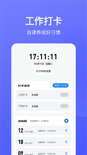 3、加班時(shí)間一鍵添加,加班時(shí)長(zhǎng)不忘記;