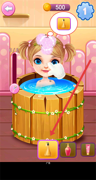 3、在浴室場景中,根據(jù)提示選擇洗浴用品如金色瓶身的洗浴產(chǎn)品,為角色進行洗浴操作。