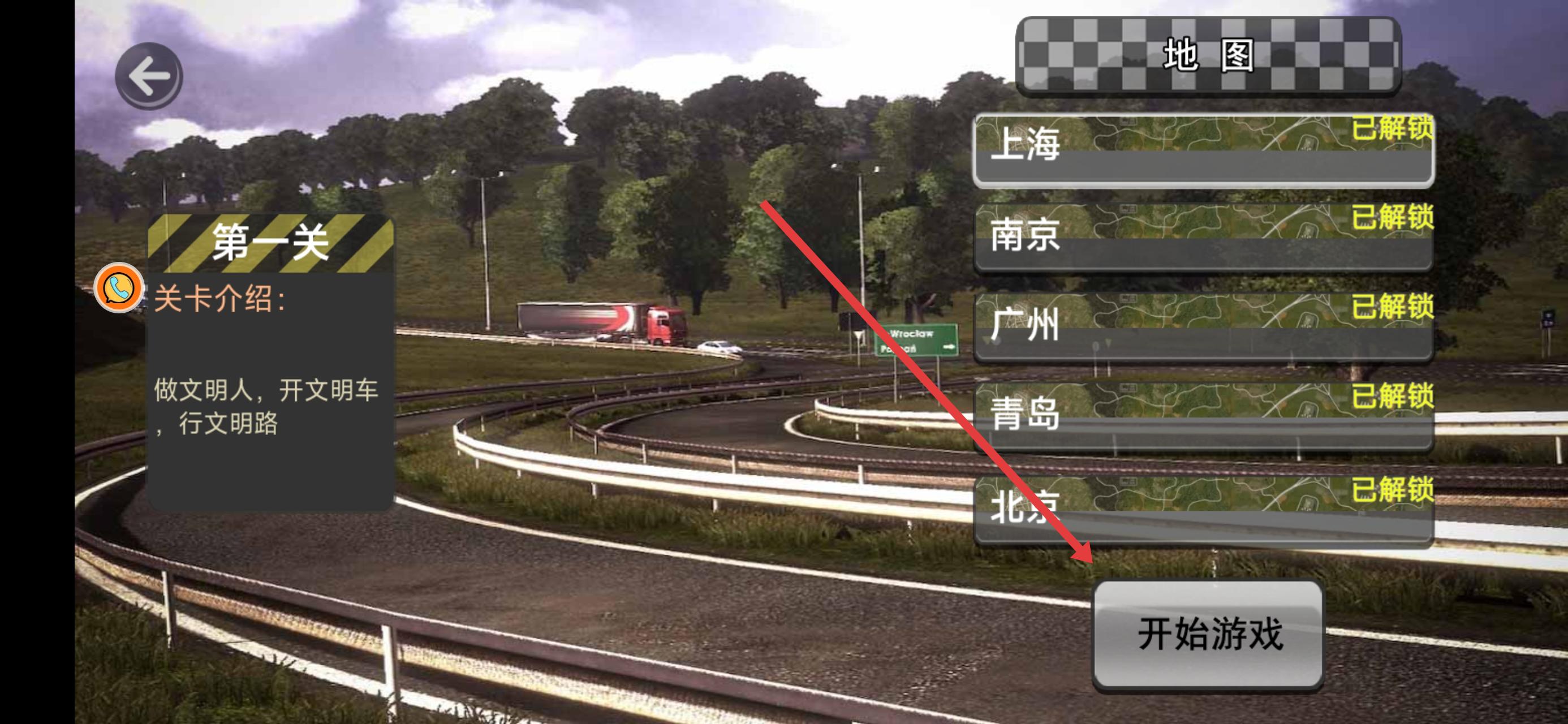 2、在關(guān)卡選擇界面,選擇想要挑戰(zhàn)的城市關(guān)卡如上海,點(diǎn)擊開(kāi)始游戲按鈕,進(jìn)入駕駛界面。