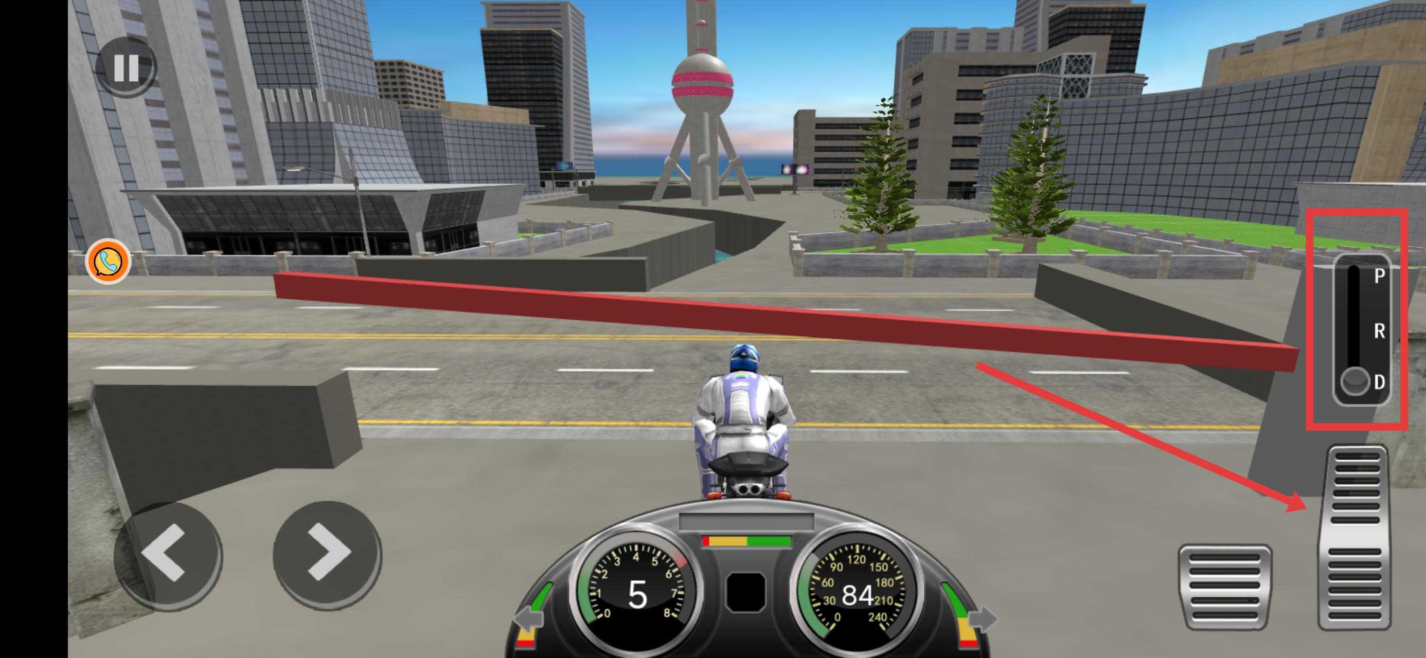 3、在駕駛界面,通過(guò)右側(cè)的換擋桿選擇擋位如D擋為前進(jìn)擋,,然后點(diǎn)擊油門踏板控制摩托車前進(jìn)。