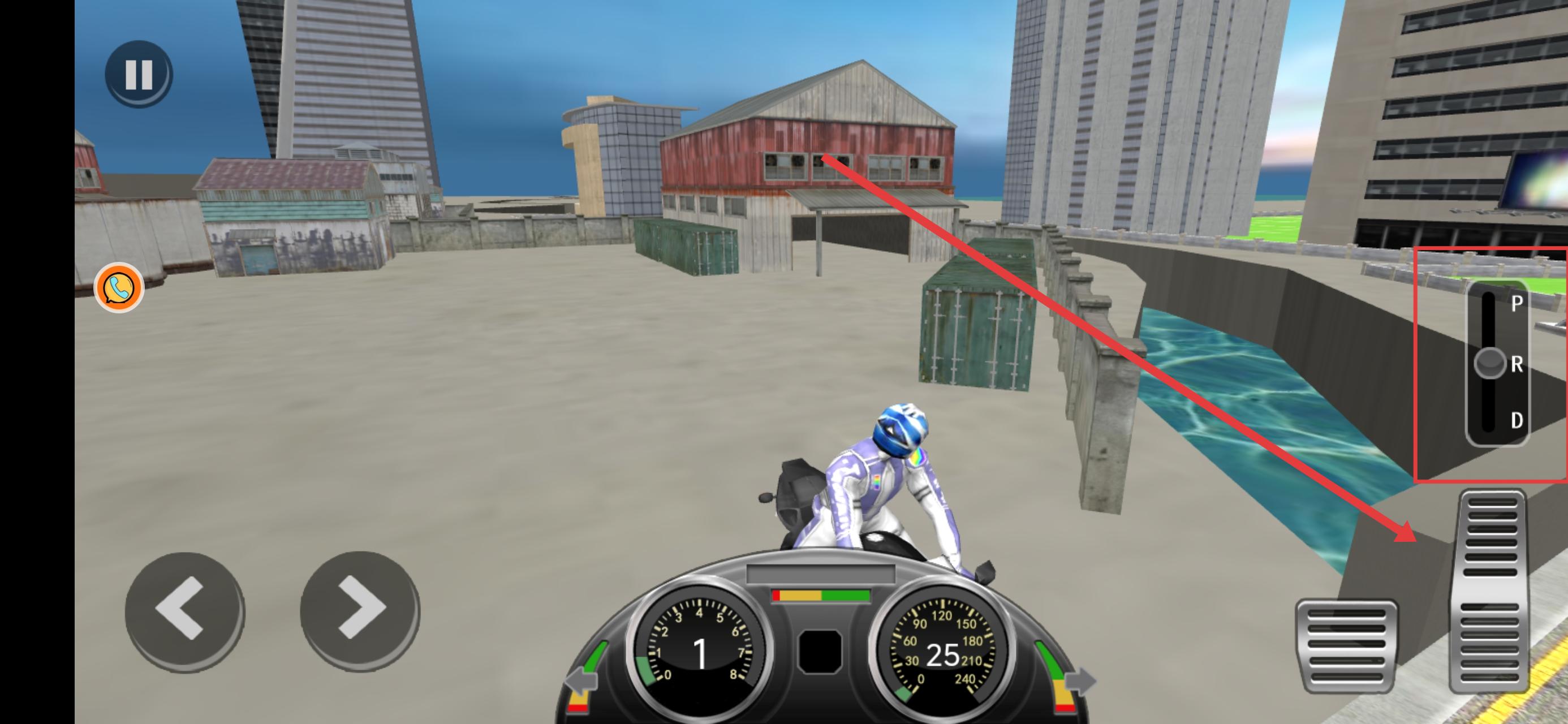 4、通過(guò)左下角的方向按鈕控制摩托車的左右轉(zhuǎn)向,點(diǎn)擊R擋倒車擋,調(diào)整摩托車方向。