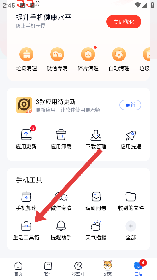 1、在360手機助手的管理頁面,點擊生活工具箱選項,進入生活工具箱界面。