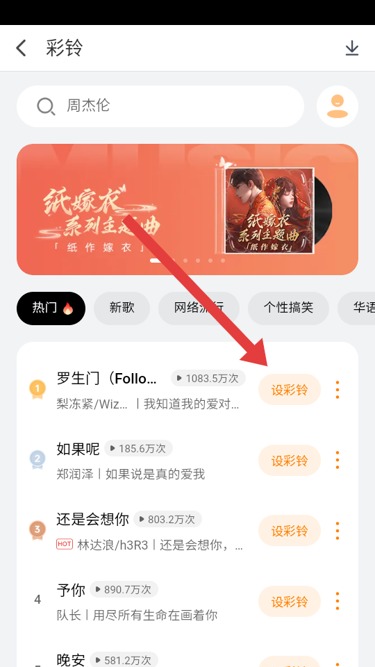 3、在彩鈴頁面,找到要設置的鈴聲,點擊設彩鈴按鈕,進入號碼登錄環(huán)節(jié)。