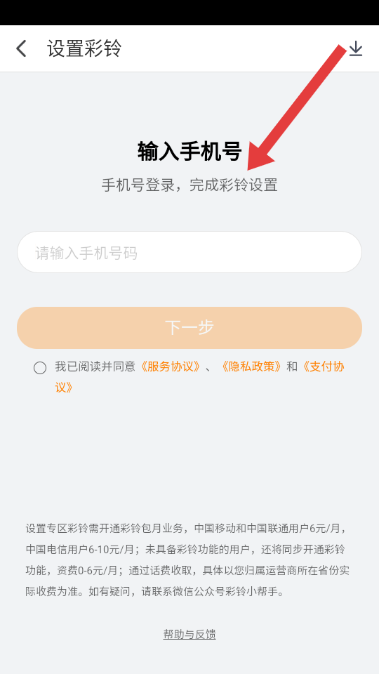 4、在設置彩鈴頁面,輸入手機號碼,勾選同意協(xié)議后,點擊下一步完成彩鈴設置。