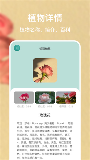 識(shí)別花是手機(jī)上的花草識(shí)別軟件,每個(gè)用戶都能快速掃描識(shí)別花草,簡(jiǎn)單的操作快速找到對(duì)應(yīng)的百科信息,了解到植物的名字和故事,同時(shí)還有多種相同的植物推薦給大家查看,是大家手機(jī)上的植物百科助手,幫助你輕松識(shí)別植物。