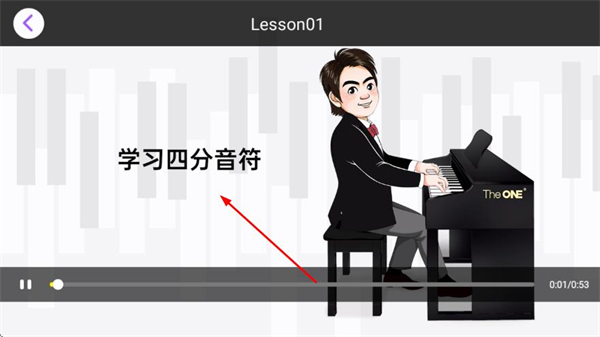 3、進(jìn)入節(jié)奏知識學(xué)習(xí)后,即可觀看學(xué)習(xí)四分音符的視頻課程,開始智能鋼琴的學(xué)習(xí)使用。