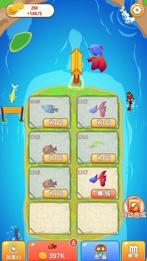 3、我們在奇妙的海底世界里面探索冒險,合成小魚。