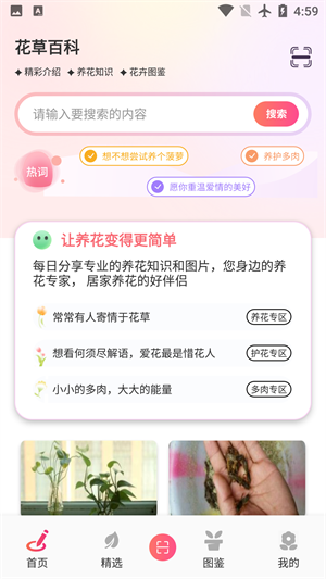 - 提供了可以直接掃一掃的功能,有不知道的花草可以使用進(jìn)行掃描就可以查找到非常全面的相關(guān)介紹信息。