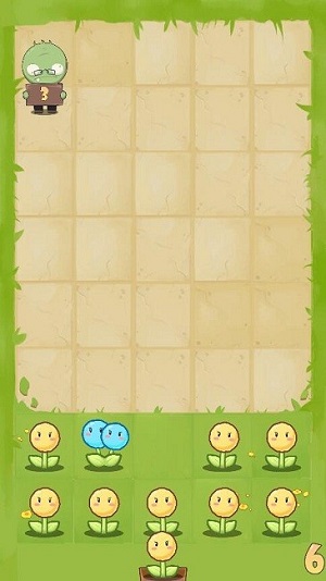 畫面上方拿著木牌的僵尸,畫面下方的花盆上滑動的手,拖到這里開始游戲,植物會發(fā)射子彈,如果它擊中僵尸,就會被扣除,木牌上的數(shù)字,如果你打到種子,你會從花盆里得到一株新植物,當然,沒有被擊中的喪尸也會向前移動一格。
