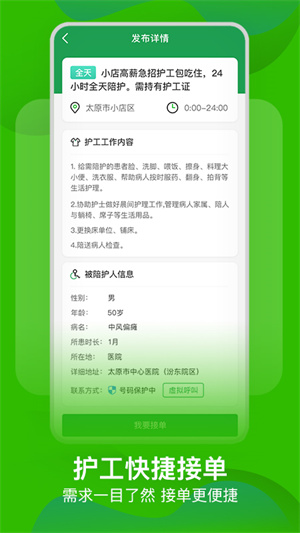 - 讓您足不出戶就能找到您滿意的護(hù)工,不僅可以給用戶帶來最貼心的服務(wù),還非常安全可靠。