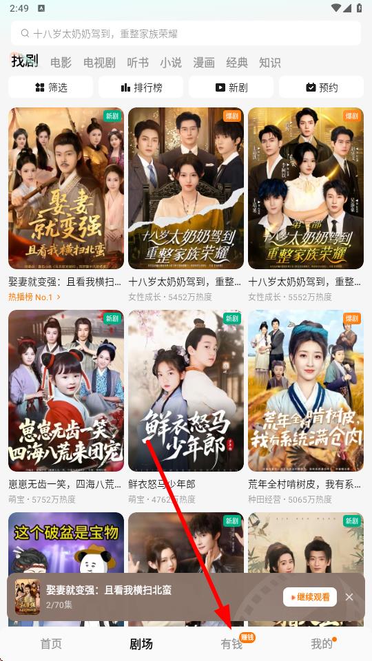 1、打開(kāi)紅果短劇應(yīng)用,點(diǎn)擊底部導(dǎo)航欄中的有錢選項(xiàng)。
