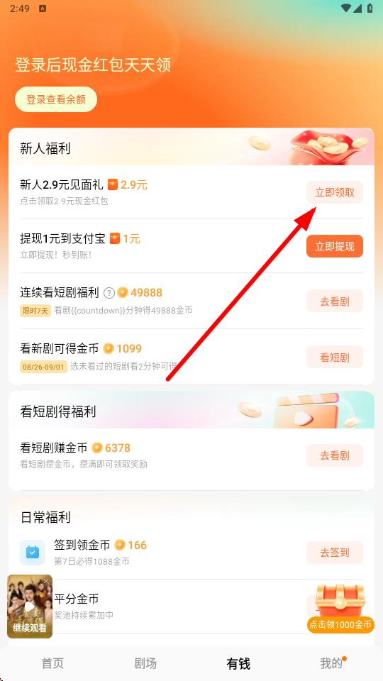 3、在有錢頁(yè)面,完成相應(yīng)任務(wù),比如領(lǐng)取新人見(jiàn)面禮,點(diǎn)擊立即領(lǐng)取達(dá)到提現(xiàn)條件后進(jìn)行提現(xiàn)。
