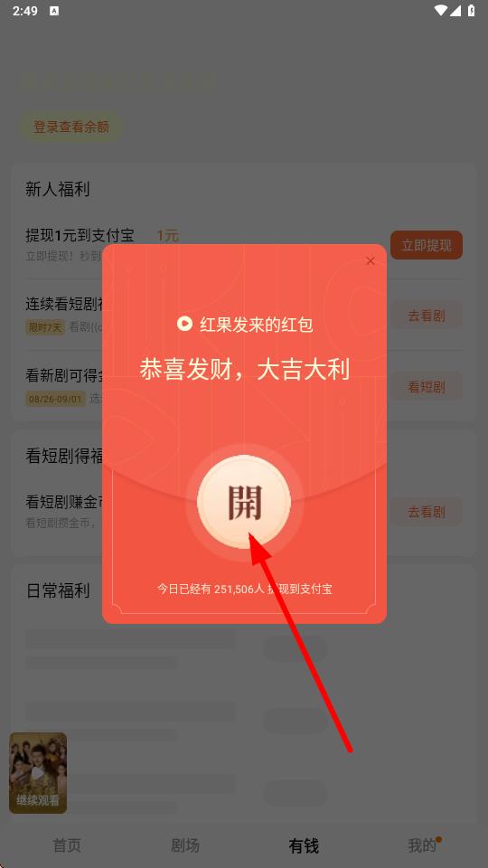 2、進(jìn)入有錢頁(yè)面后,可能會(huì)彈出紅包,點(diǎn)擊紅包中間的開(kāi)。