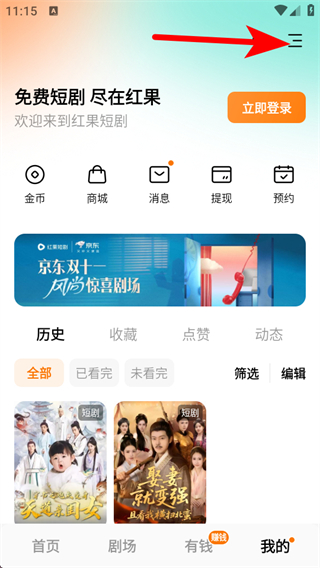 1、在紅果短劇我的頁(yè)面,點(diǎn)擊右上角三條橫線圖標(biāo),彈出功能菜單。