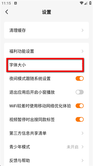 3、在設(shè)置頁(yè)面,點(diǎn)擊字體大小選項(xiàng),進(jìn)入字體大小預(yù)覽界面。