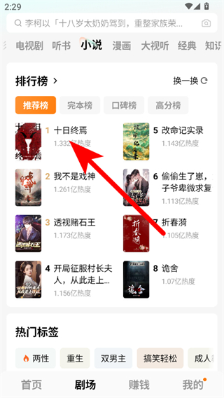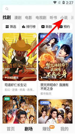 1、在紅果劇場(chǎng)頁(yè)面,點(diǎn)擊小說(shuō)分類,進(jìn)入小說(shuō)列表頁(yè)面。
