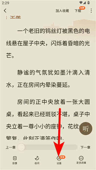 3、在小說(shuō)閱讀頁(yè)面,點(diǎn)擊設(shè)置選項(xiàng),展開(kāi)設(shè)置菜單。