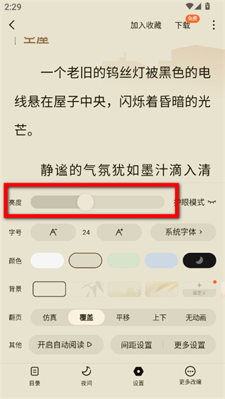 4、在設(shè)置菜單中,拖動(dòng)亮度調(diào)節(jié)條向右,即可提高閱讀界面的亮度。