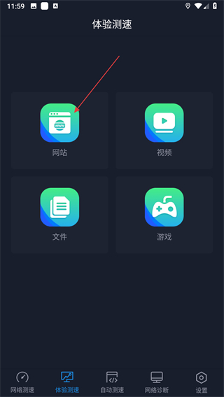 2、在體驗(yàn)測(cè)速頁面,選擇網(wǎng)站選項(xiàng),進(jìn)入網(wǎng)站測(cè)速頁面。