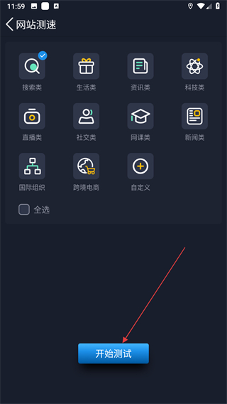 3、在網(wǎng)站測(cè)速頁面,選擇要測(cè)試的網(wǎng)站類別,點(diǎn)擊開始測(cè)試。
