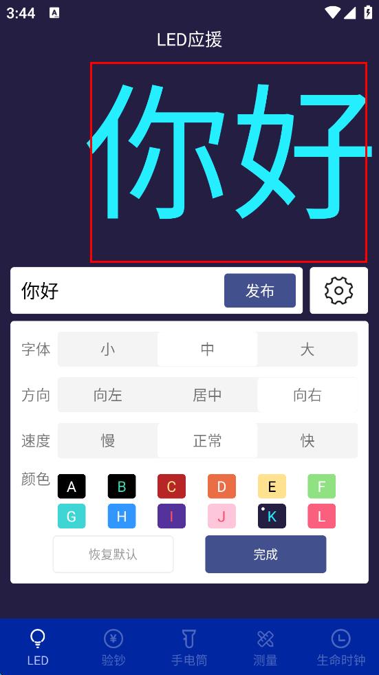 4、設置好字體、方向、速度、顏色等參數后,點擊完成按鈕,即可查看LED應援顯示效果。