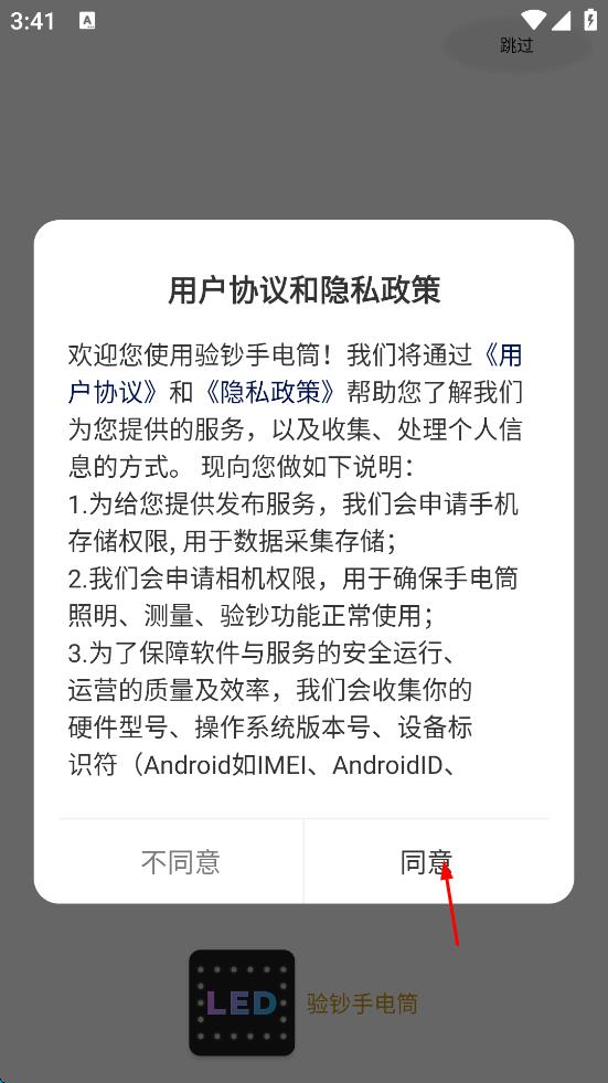 1、打開驗鈔手電筒APP,出現用戶協議和隱私政策彈窗,仔細閱讀內容后,點擊同意按鈕。