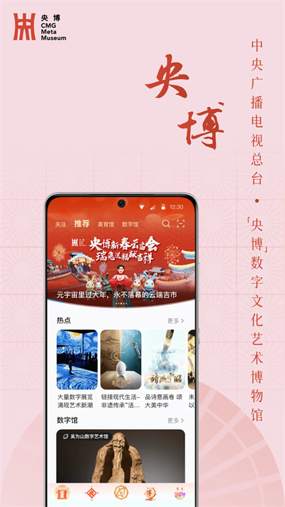 央博,全稱中央廣播電視總臺“央博”數(shù)字文化藝術(shù)博物館,定位為國家級數(shù)字文化藝術(shù)綜合服務平臺,將以APP為主平臺,以央博元宇宙藝術(shù)空間為核心,整合國內(nèi)外博物館資源、書畫藝術(shù)資源、美育資源、藝術(shù)品交易資源,聚創(chuàng)新之力、展藝術(shù)之美、育未來之才,發(fā)展數(shù)字書畫藝術(shù)消費新場景,服務國家文化數(shù)字化戰(zhàn)略,服務美好生活。