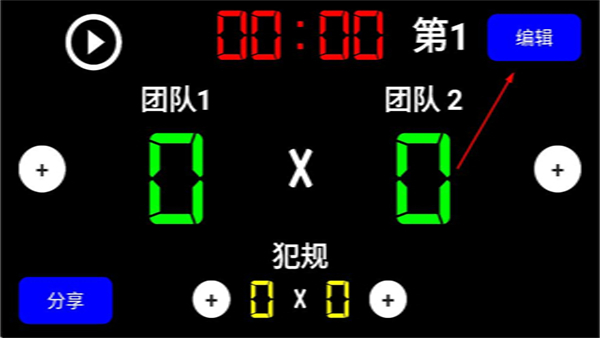 3、在足球計分界面點擊編輯按鈕,進入編輯界面可對時間、場次、團隊分?jǐn)?shù)和犯規(guī)數(shù)進行設(shè)置。
