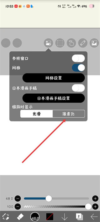4、在彈出的菜單里,找到縮放時(shí)顯示選項(xiàng),點(diǎn)擊切換至像素化即可完成設(shè)置。