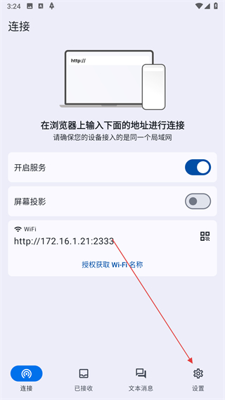 1、打開文件閃傳應(yīng)用,進(jìn)入連接頁面后,點(diǎn)擊底部導(dǎo)航欄右側(cè)的設(shè)置選項(xiàng)。