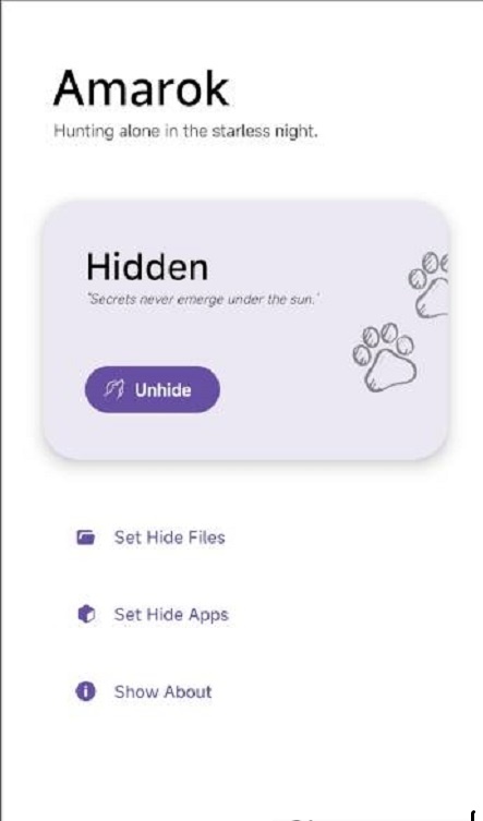 Amarok一個輕量級的安卓文件應用隱藏器,旨在保護您的隱私。他們經常使用高級加密工具來加密他們的個人文件。它們當然是安全的,但是它們需要很長時間來加密并且加密大文件可能會很痛苦。只是不想不小心被別人看到,或者交給了錯誤的人。你只需要一個工具來避免被隨便看到并保持其他人的興趣,專業(yè)級加密機制,如圖案鎖,應用級保護。