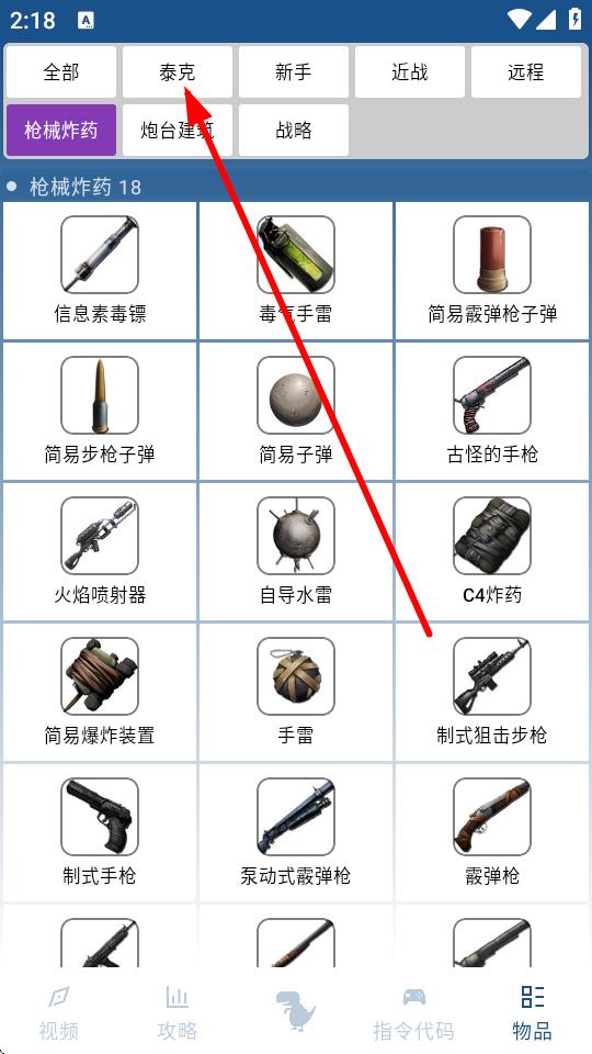 2、進(jìn)入物品界面后,在上方分類標(biāo)簽中點(diǎn)擊泰克選項(xiàng)。