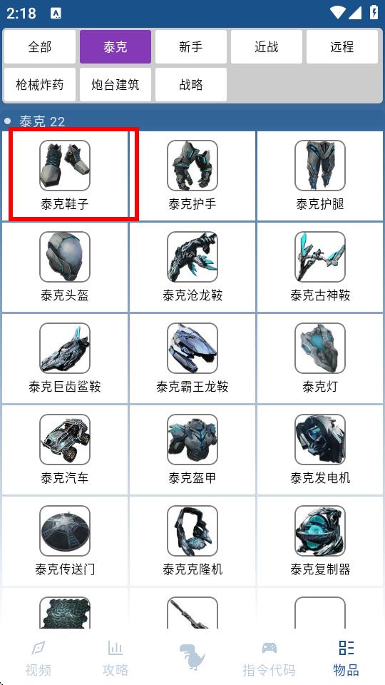 3、在泰克分類下,會(huì)展示各種泰克物品,找到你想查看屬性的泰克物品,比如泰克鞋子,點(diǎn)擊該物品圖標(biāo)。