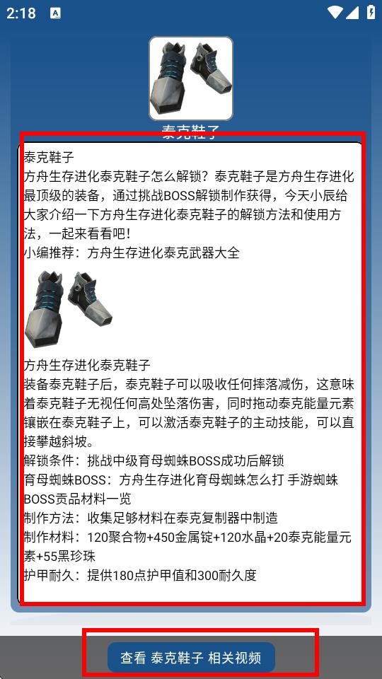 4、點(diǎn)擊后會(huì)進(jìn)入該泰克物品的詳情頁(yè)面,能看到關(guān)于該物品的詳細(xì)介紹,包括解鎖方法、使用方式、制作材料、護(hù)甲耐久等屬性信息,還可點(diǎn)擊下方按鈕查看相關(guān)視頻。