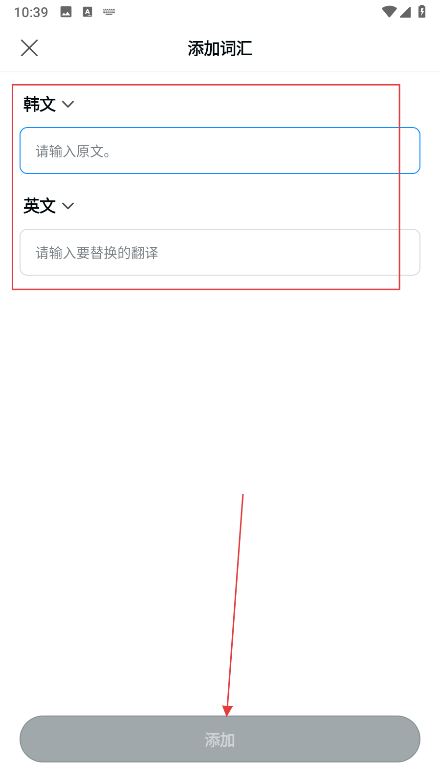 4、在添加詞匯頁(yè)面,選擇原文語(yǔ)言并輸入原文內(nèi)容,再選擇目標(biāo)語(yǔ)言并輸入要替換的翻譯,最后點(diǎn)擊添加按鈕。
