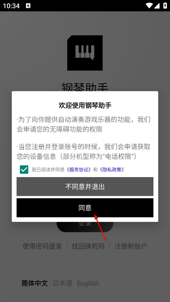 1、打開鋼琴助手,在彈出的歡迎使用提示框中,勾選我已閱讀并同意服務(wù)協(xié)議和隱私政策,然后點擊“同意”。