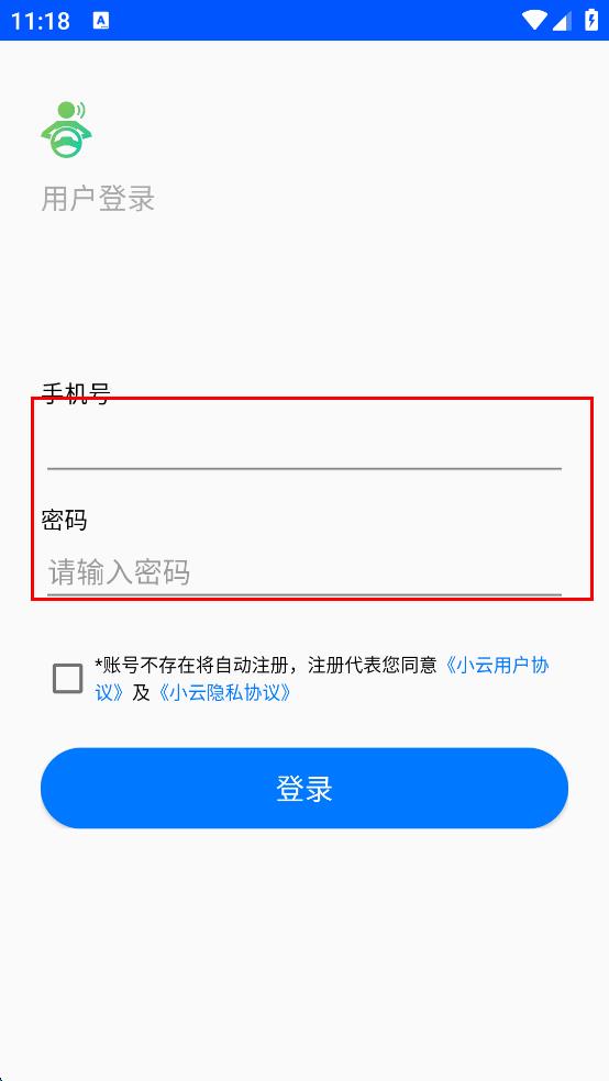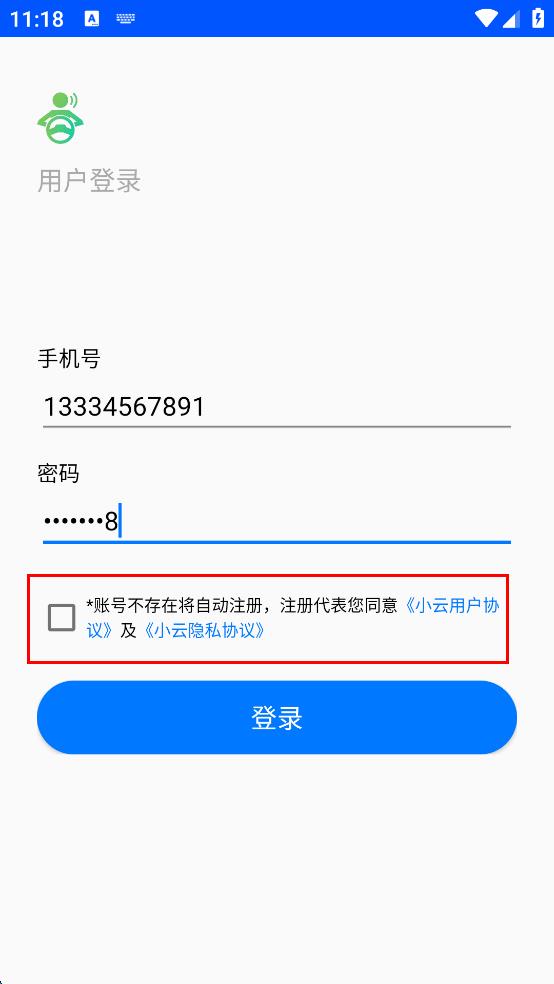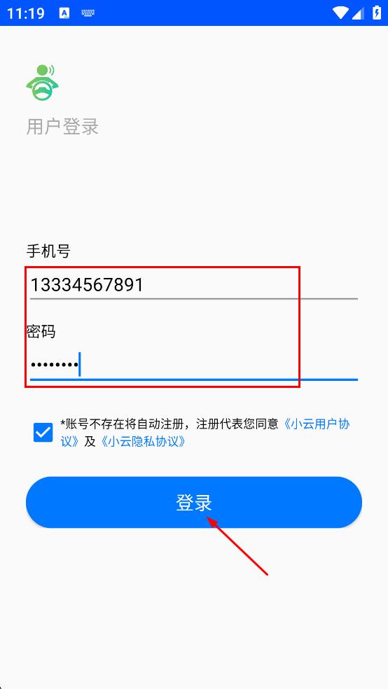 3、勾選賬號(hào)不存在將自動(dòng)注冊(cè)且同意小云用戶協(xié)議及小云隱私協(xié)議。